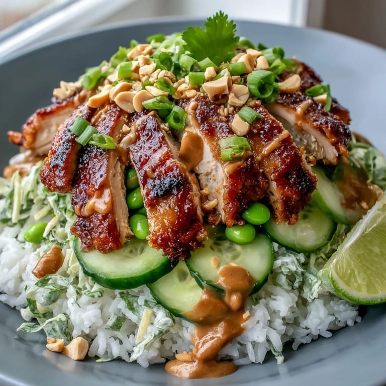 Pin It I stumbled onto this bowl at a tiny food stall tucked between two buildings in a neighborhood I'd never explored before. The vendor was layering rice, grilled chicken, and vegetables with such practiced ease that I just watched, mesmerized, as she drizzled peanut sauce over everything. When I took that first bite, something clicked—the creamy coconut rice, the charred chicken, the crisp vegetables all talking to each other through that silky peanut sauce. I went home and spent three weeks perfecting it in my own kitchen, mostly because I couldn't stop thinking about it.