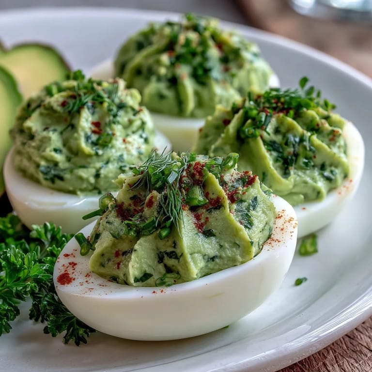 The secret to perfect deviled eggs lies in the balance of creamy filling and properly cooked eggs. This recipe uses the gentle boiling method to ensure tender whites and yolks that are cooked through but not rubbery. The avocado filling is enhanced with fresh chives and dill, creating a springtime flavor profile that's both sophisticated and approachable. A touch of Dijon mustard and lemon juice adds brightness, while garlic powder provides subtle depth. These elegant bites are proof that simple ingredients can create something truly memorable.